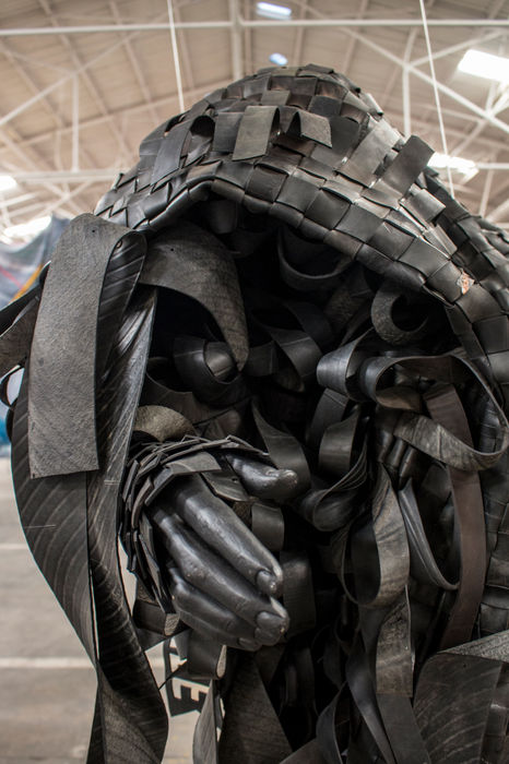 I draw on the history of my roots in the Democratic Republic of Congo as well as the irony of contemporary urban degradation masked as development. Through the recovery of waste materials such as inner tubes from vehicle tyres, industrial packaging and textiles combined with my use of paint and African fabric, I repurpose and reinterpret what others discard. Beyond the intentional recycling element of this process, the visual concepts I explore surface a range of the pertinent issues.”